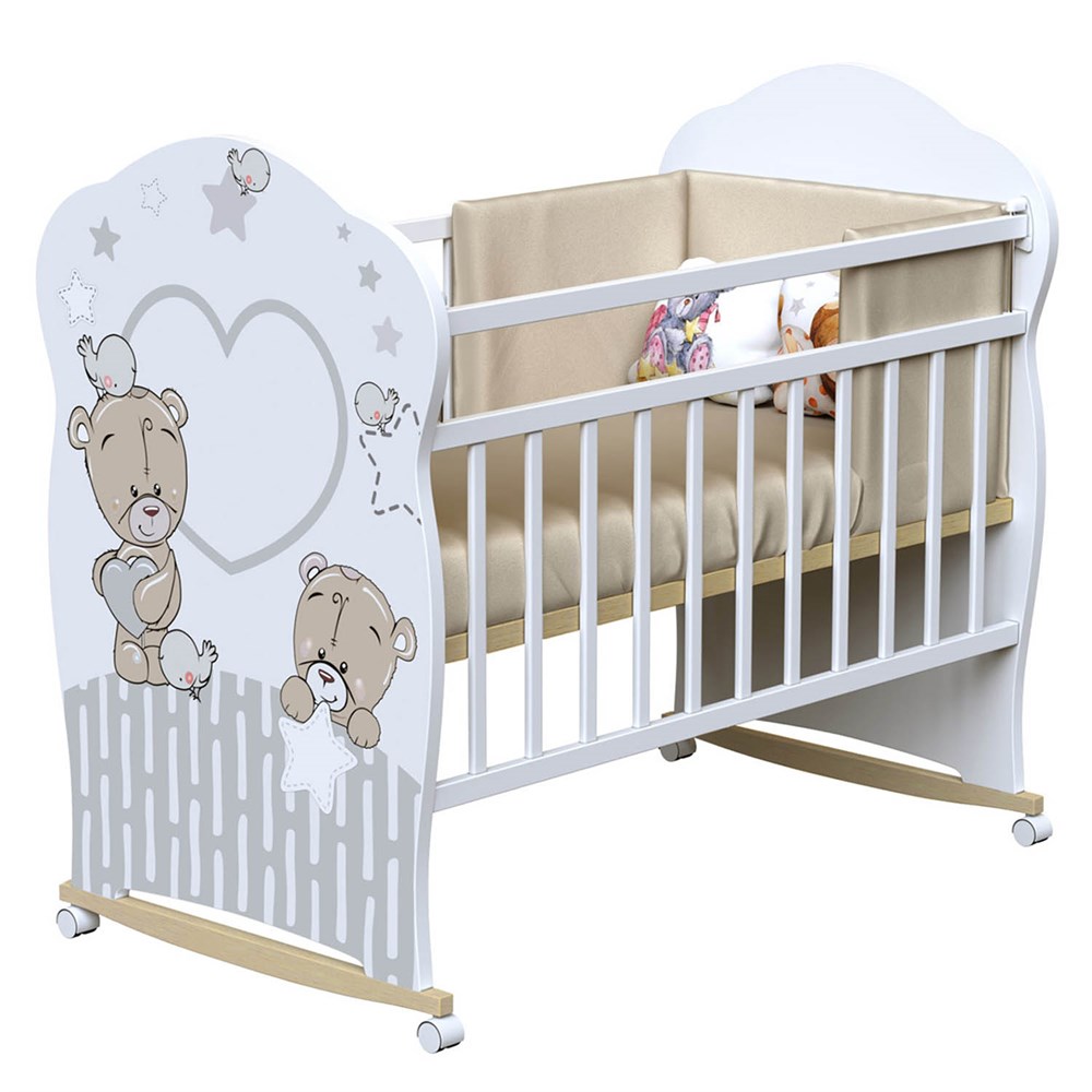 Детская кроватка в оригинальном дизайне отличается необычной формой стенок с округлыми краями, которые создают ощущение сказки и волшебства в детской комнате. Милый рисунок с забавными медвежатами дополнит любой интерьер и понравится каждому малышу! Кроватка оснащена полозьями для качания и колесной базой, которые легко можно менять местами при необходимости. Есть два уровня ложа - можно регулировать по мере роста крохи.