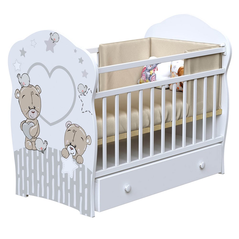 Детская кроватка в оригинальном дизайне отличается необычной формой стенок с округлыми краями, которые создают ощущение сказки и волшебства в детской комнате. Милый рисунок с забавными медвежатами дополнит любой интерьер и понравится каждому малышу! Кроватка оснащена маятником - позволяет мягко укачивать ребенка перед сном, а также большим ящиком, куда поместятся все необходимые вещи и аксессуары малыша. Есть два уровня ложа - можно регулировать по мере роста крохи.