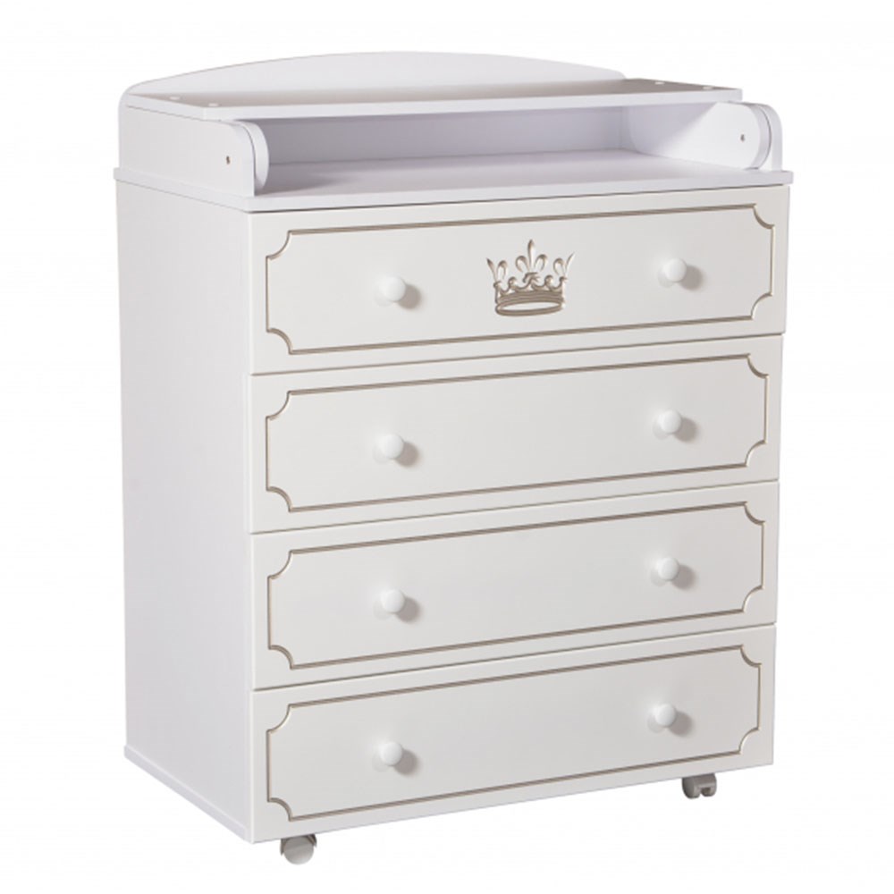 Детский пеленальный комод, декорированный красочным рисунком. На белых комодах рисунок выполнен серебром, на комодах цвета слоновой кости - золотом.