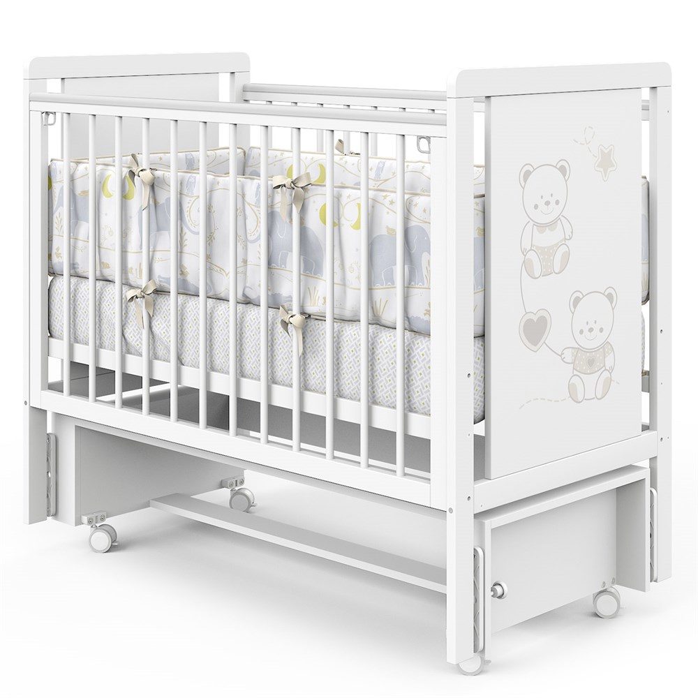 Кроватка детская Indigo "Happy Friends" (маятник + колёса), белая аляска — мишки