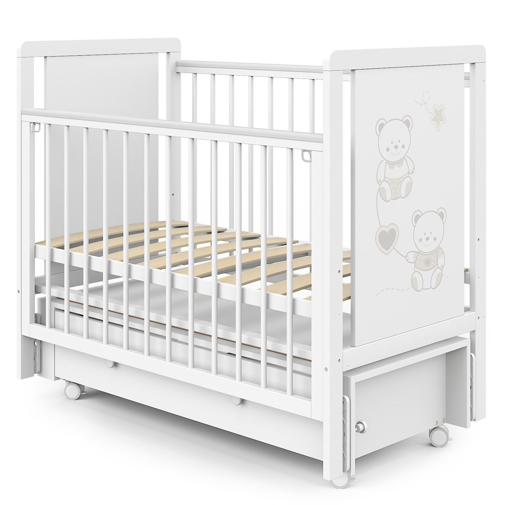 Кроватка детская Indigo "Happy Friends" (маятник + колёса, ящик), белая аляска — мишки
