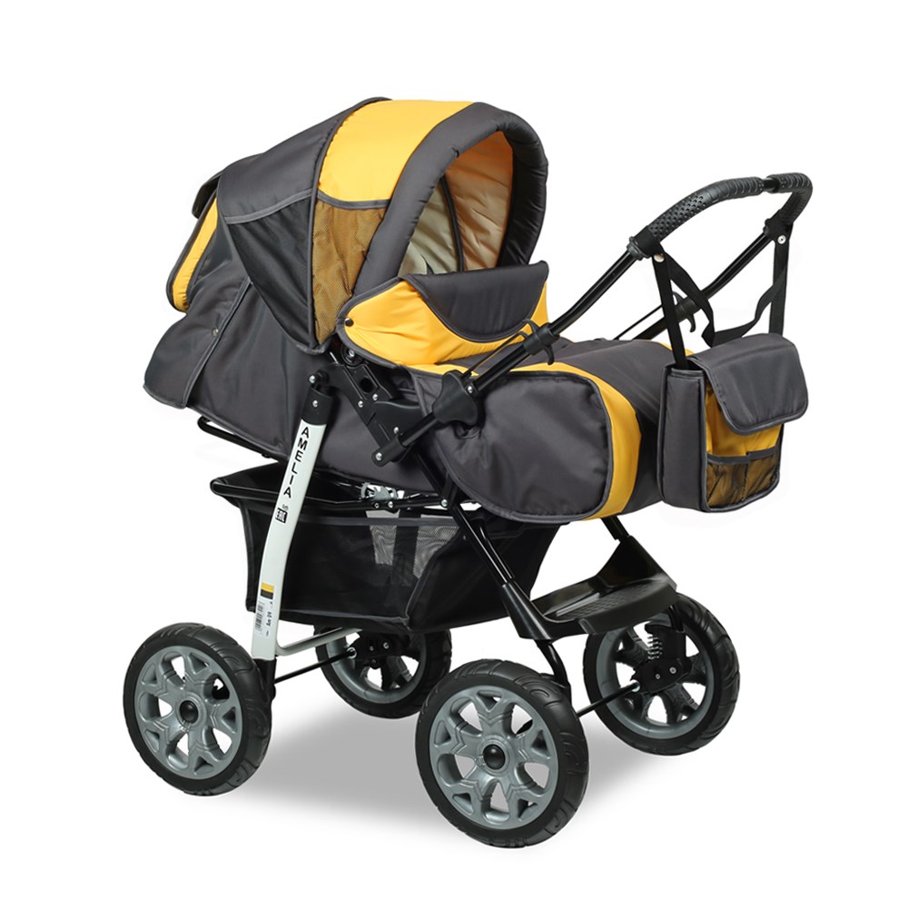 Широкие колеса на пластиковых дисках не утяжеляют модель. Легким нажатием на рычаги ручка коляски перекидывается на обе стороны. Жесткость пружинной амортизации регулируется специальными переключателями. Легкий и компактный конверт с крепкими длинными ручками может использоваться как внутренний блок люльки, а может служить самостоятельным аксессуаром для переноски малыша на сравнительно небольшие расстояния. Надежное основание и застежка-молния делают его очень удобным и практичным. Помимо вместительной сумки для вещей, имеется глубокий карман на капоре коляски, что весьма практично. Такие характеристики коляски Амелия как качество и надежность также отмечены покупателями в числе ее сильных сторон.