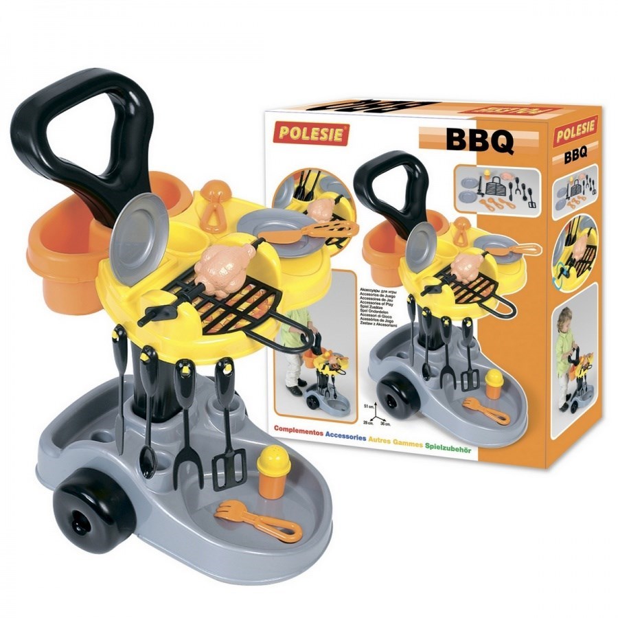 В наборе: тележка, вертел с цыпленком (цыпленок с вертела не снимается), солонка, решетка барбекю, две тарелки, вилка для мяса, вилка,лопатка кухонная, два ножа разной формы, две ложки разной формы.
