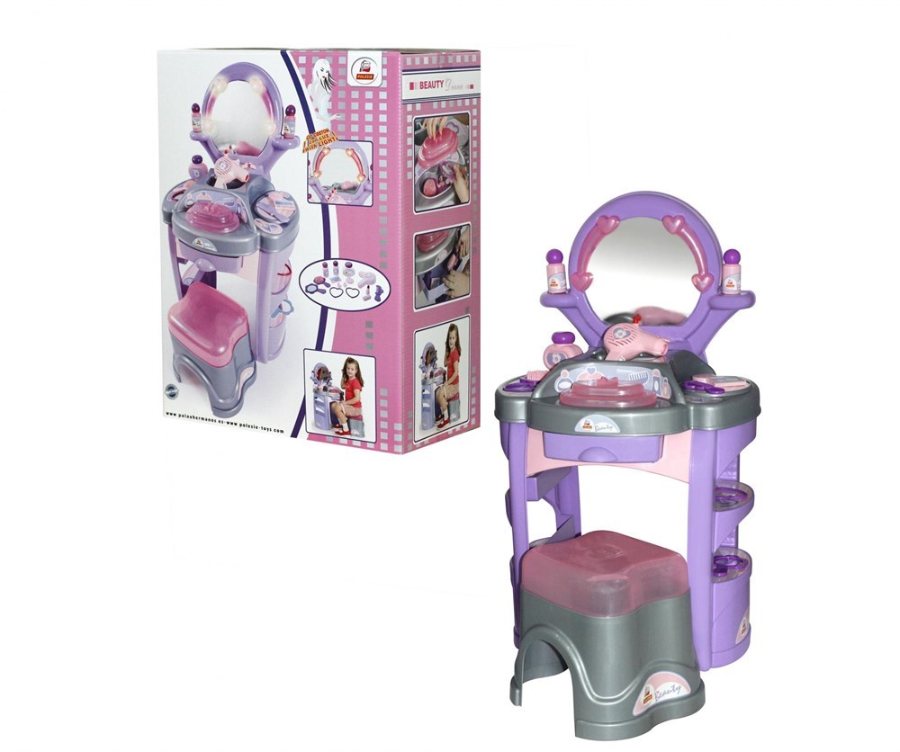 Целая студия для юных модниц. Салон красоты содержит все самое необходимое: столик-стеллаж с зеркалом, табурет, дополнительные маленькие аксессуары.