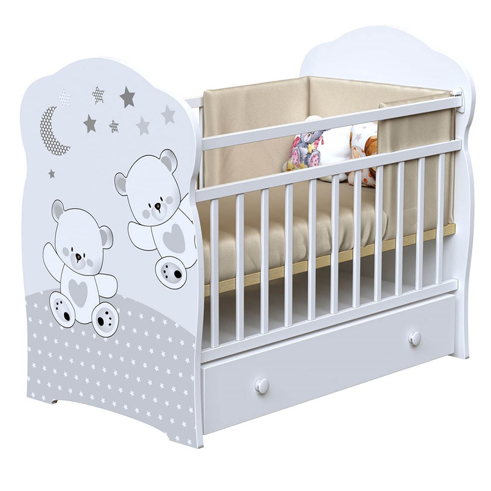 Функциональная детская кроватка ВДК FUNNY BEARS с универсальным стандартным спальным местом (120х60см) под которое вы можете подобрать любой понравившийся матрасик. Модель оснащена поперечным маятником, который позволит мягко укачивать кроху перед сном. Также, есть большой закрытый ящик для хранения детских аксессуаров и вещей. Кроватка выполнена в двух цветовых вариациях: слоновая кость и белый. А милый принт с медвежатами украсит любую детскую комнату! Можно купить как мальчику, так девочке.